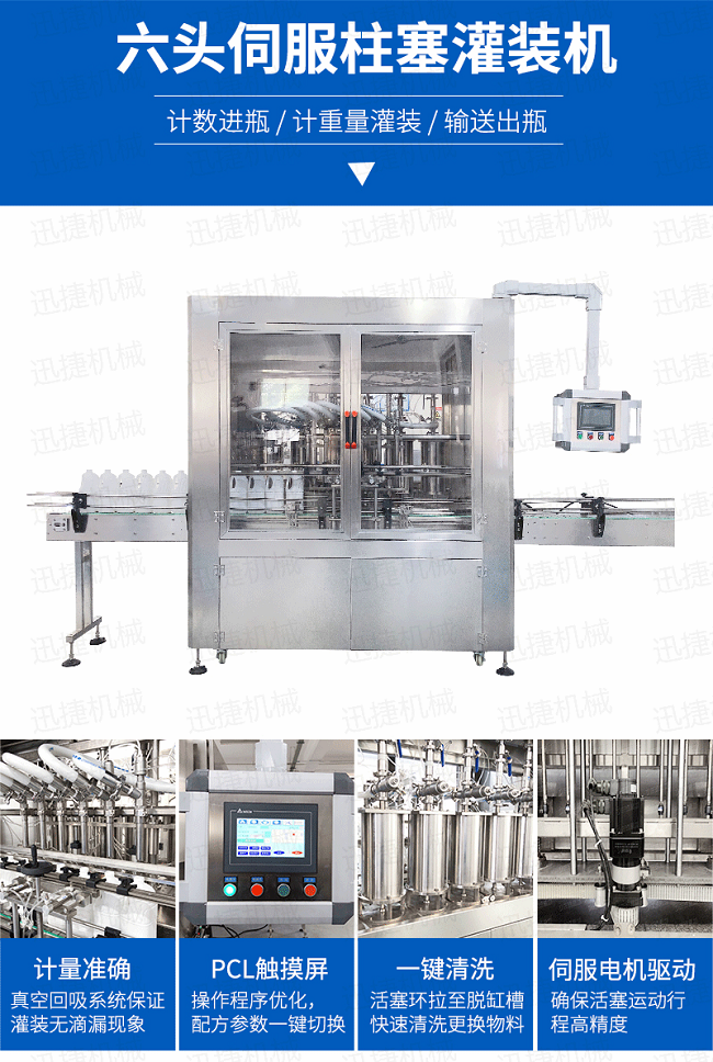 全自動16頭伺服柱塞灌裝機是我公司精心設(shè)計的新款灌裝機,本伺服柱塞灌裝機,采用PLC和觸摸屏自動化控制,具有計量準(zhǔn)確、結(jié)構(gòu)運行平穩(wěn)、噪音低、調(diào)節(jié)范圍大、灌裝速度快等優(yōu)點。而且對易揮發(fā)、易結(jié)晶、易起泡的液體;對橡膠、塑料有極強的腐蝕的液體,以及高粘度的液體、半流體都能適應(yīng)。在人機界面數(shù)字化調(diào)節(jié)計量,并且可設(shè)定100ml或200ml等所需計量,觸摸屏一觸即達,而且可以單頭微調(diào)計量。