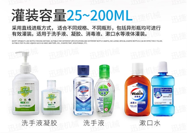全自動凝膠生產線適用于消毒凝膠、免洗手洗手液、免洗手消毒凝膠、消毒液、84消毒液、醫用酒精、75%酒精消毒液、75度酒精、消毒水、殺菌消毒劑、醫用酒精、碘酒、次氯酸鈉、劑、醫用乙醇消毒液、瓶裝消毒劑等產品,有多頭全自動消毒液灌裝機和封箱機、貼標機、打包機、噴碼機等配套設備組成,實現消毒液自動灌裝,自動旋蓋,自動貼標,從灌裝、到成品的全部過程
