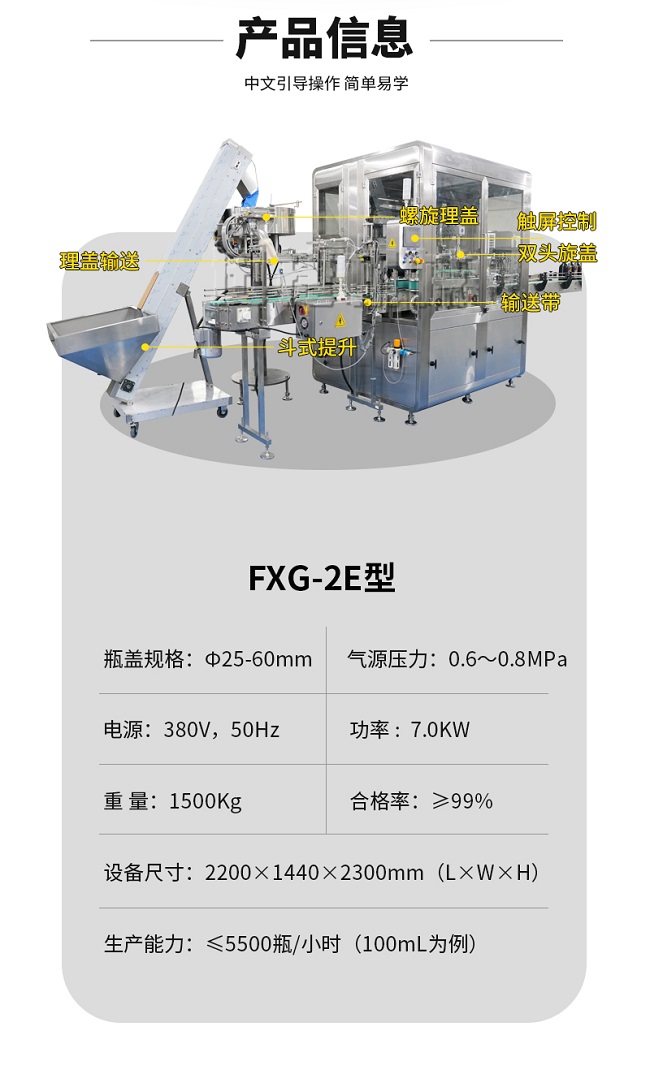 FXG-2E型全自動雙頭跟隨式旋蓋機(jī)由理蓋輸蓋機(jī)構(gòu)、抓蓋旋蓋機(jī)構(gòu)、運(yùn)動模塊、