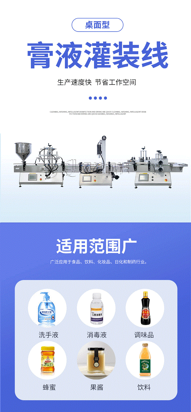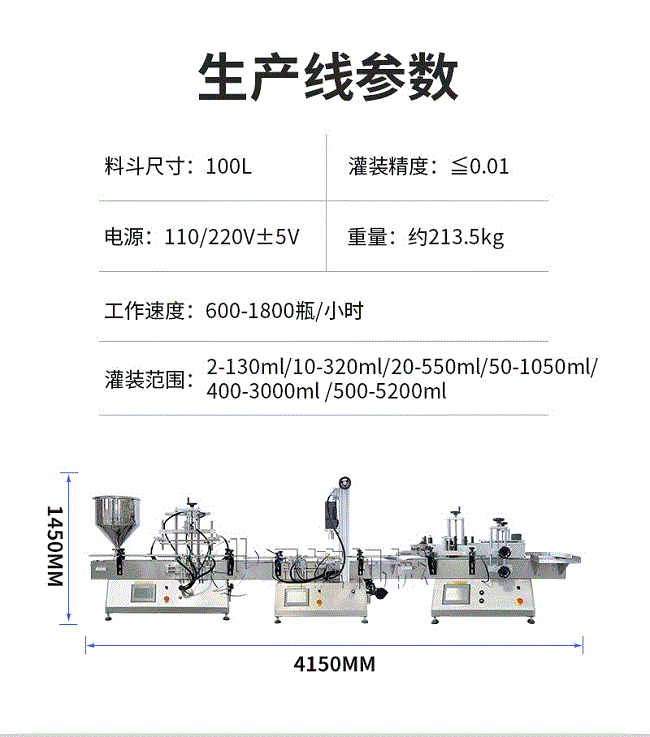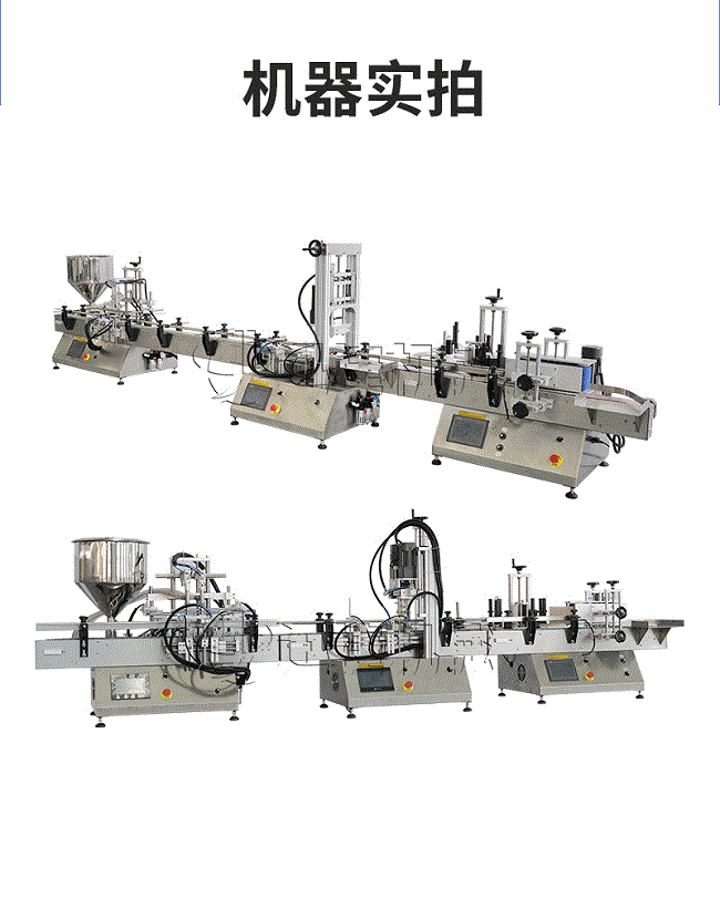 產品說明:生產線根據灌裝范圍選擇型號,灌裝部分為雙頭下潛式灌裝機,適用于不同物料不同瓶子的灌裝,配備自動壓蓋機和圓瓶貼標機,可實現不同蓋子的旋蓋貼標工作。