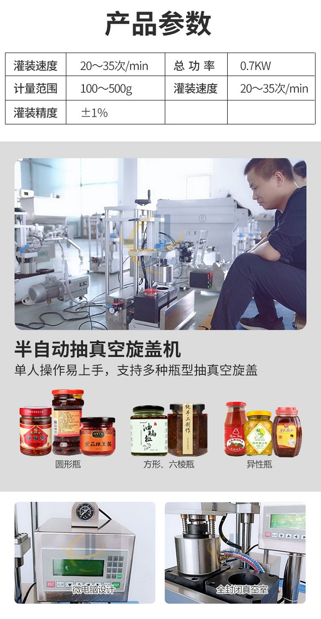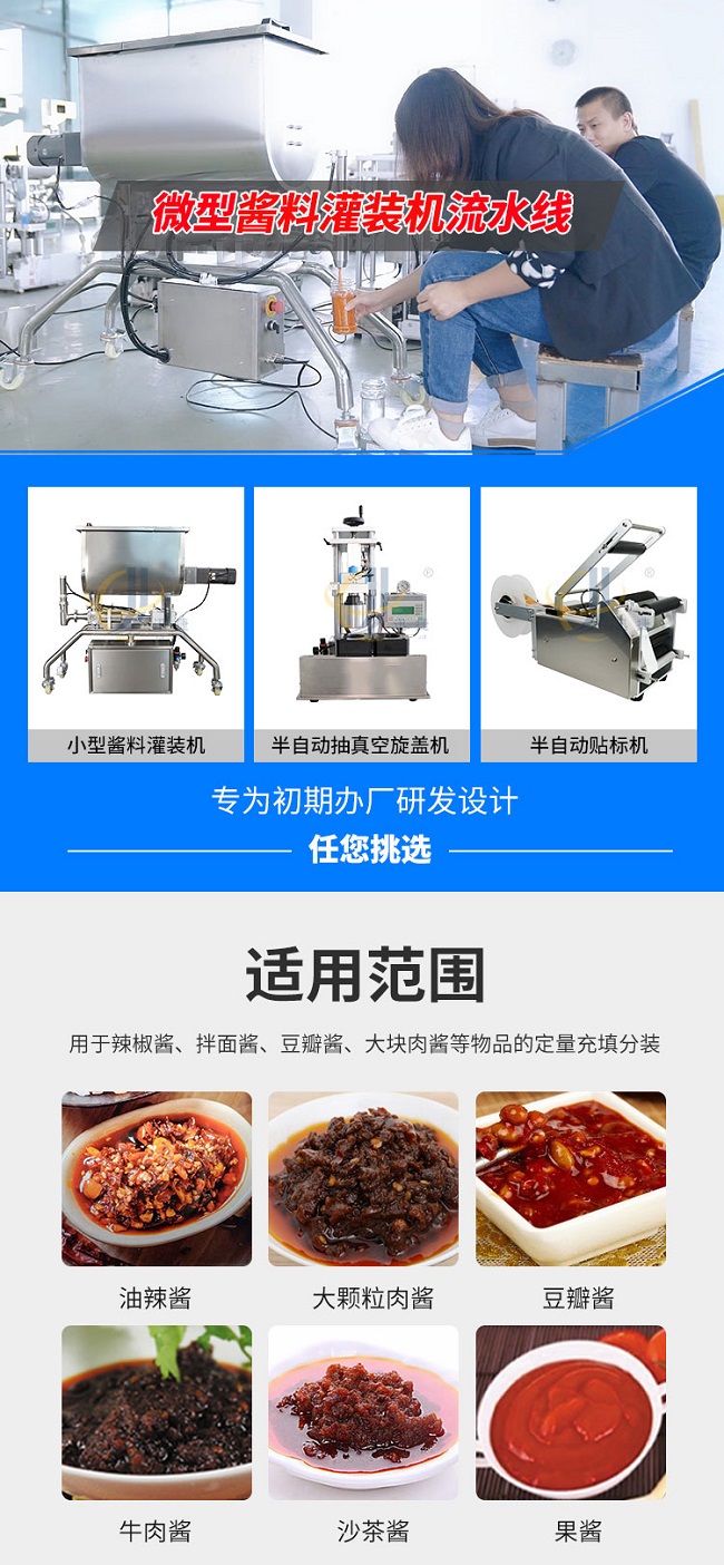 我公司新研發小型醬料灌裝生產線,包含三款小設備,小型醬料灌裝機、半自動抽真空旋蓋機、半自動貼標機、該小型醬料生產線專為初期辦廠研發設計,適用于辣椒醬、拌面醬、豆瓣醬、大塊醬等醬料的定量灌裝,該產品支持定制,選用306不銹鋼材質,灌裝精度高,防止滴漏,選用plc觸屏智能控制,防滴漏防拉絲,突破傳統的灌裝方式,可根據瓶子高度調整灌裝頭高度,采用防滴漏設計,灌裝時不滴不漏。