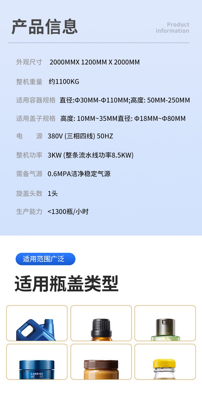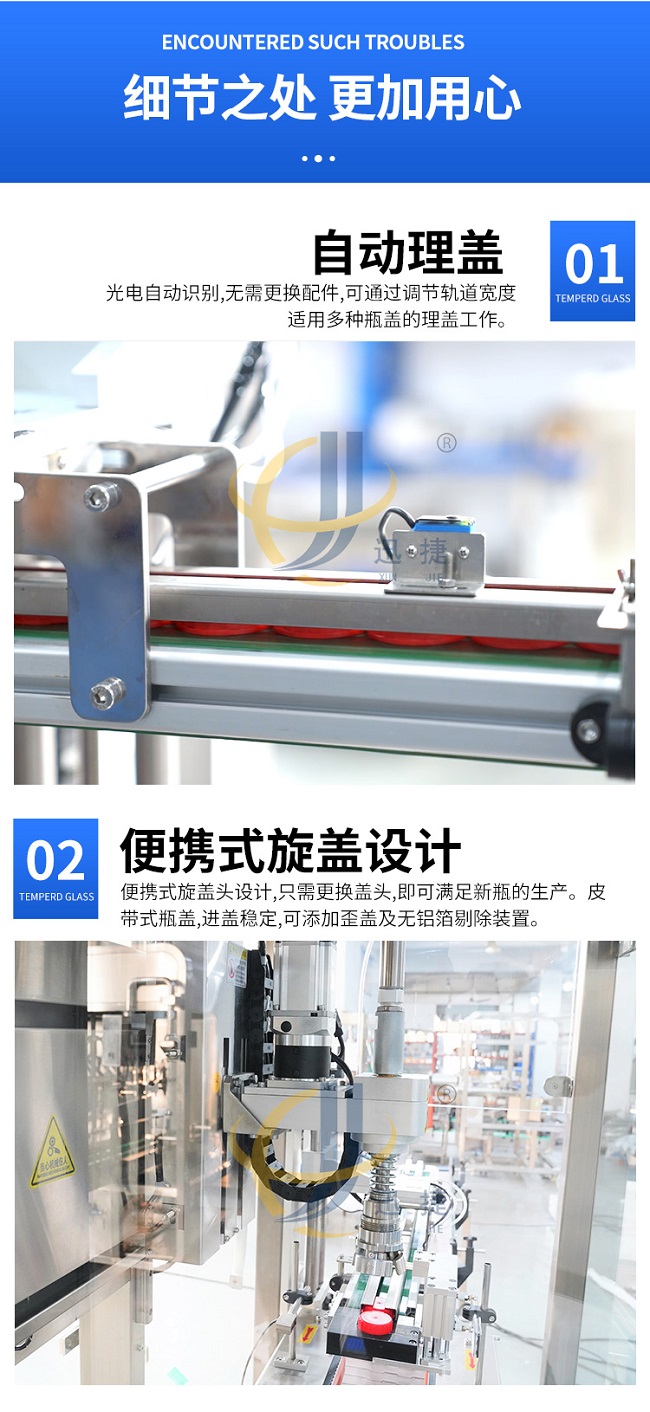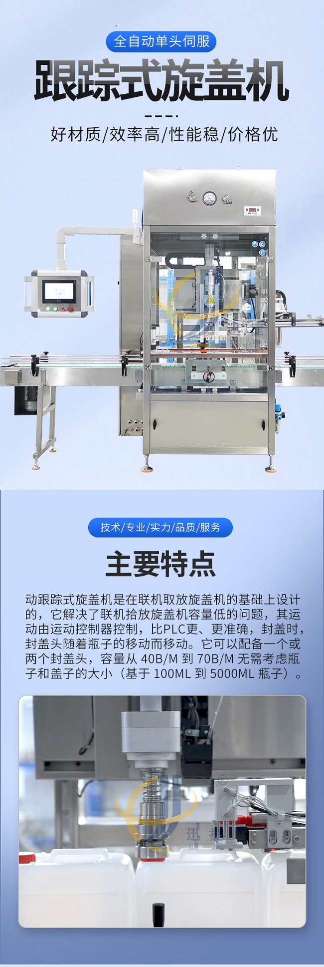 跟蹤式旋蓋機是在聯機取放旋蓋機的基礎上設計的,它解決了聯機拾放旋蓋機容量低的問題,其運動由運動控制器控制,比PLC更、更準確,封蓋時,封蓋頭隨著瓶子的移動而移動。它可以配備一個或兩個封蓋頭,容量從 40B/M 到70B/M 無需考慮瓶子和蓋子的大?。ɑ?100ML到5000ML瓶子)。