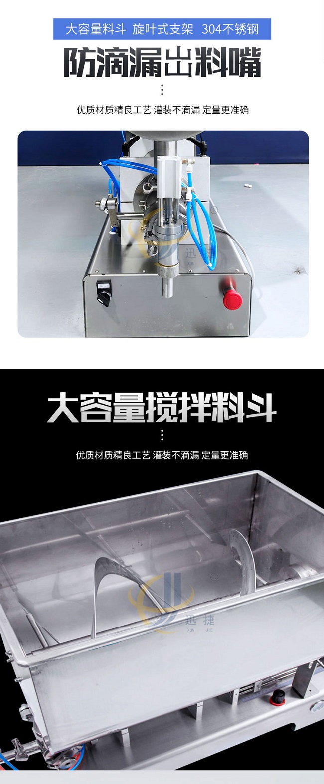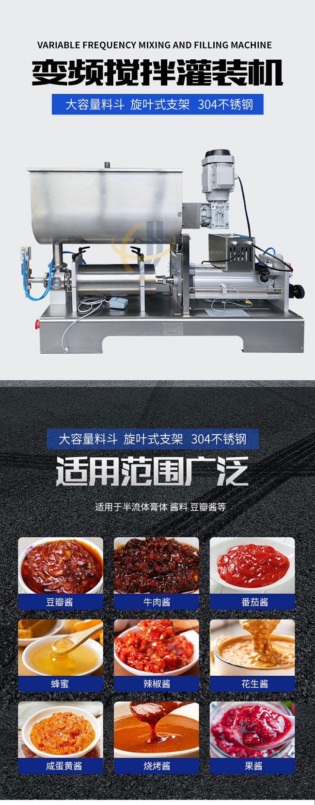 變頻攪拌醬料灌裝機采用大容量料斗、旋葉式支架、304不銹鋼,適用范圍廣。