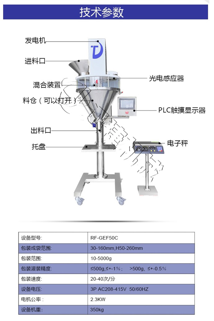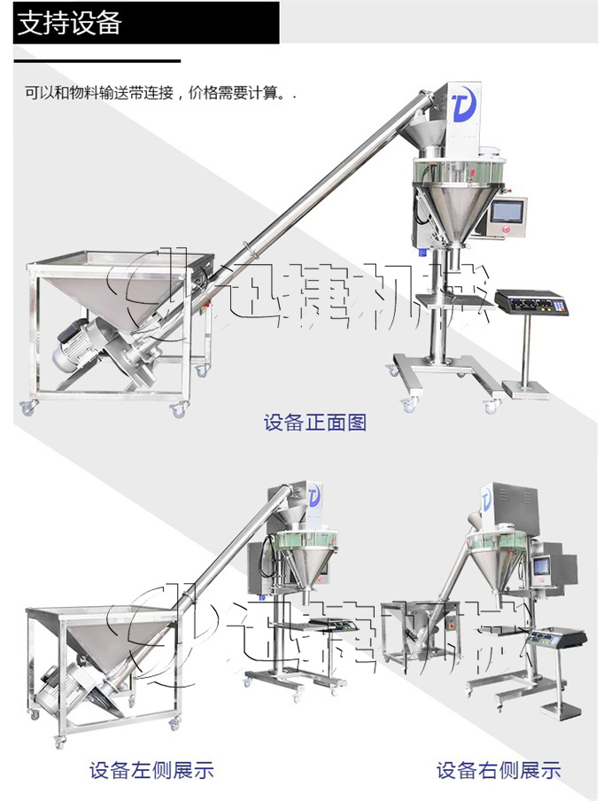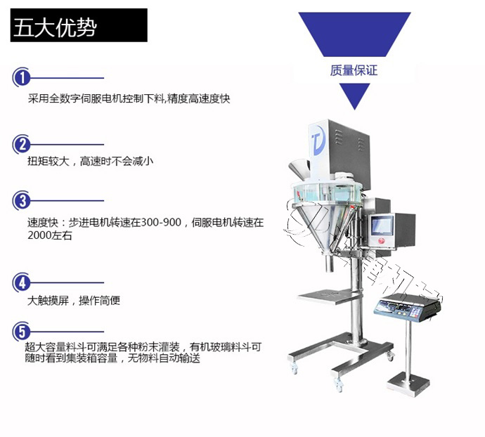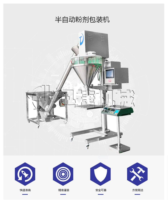 該粉劑包裝機適用于有一定流動性的粉劑狀、顆粒狀物料,可適合袋類、罐類、瓶類等各種包裝容器粉劑定量包裝,速度快、精度高。如農藥、獸藥、預混料、添加劑、奶粉、淀粉、調味品、酶制劑、飼料等粉劑狀、雞精、餃子粉、葡萄糖、奶粉、綠豆粉、淀粉、調味料、飼料、顆粒狀物料的定量包裝。該款半自動粉劑包裝機在市場深受顧客喜愛,自然有它的優勢,該設備提高工作效率、降低生產成本計量準確、包裝規格大小均可成品干凈整潔、粉塵不外粘機器性能穩定、使用壽命長占用空間小、操作簡便、移動方便。