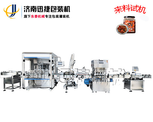 該瓶裝醬灌裝旋蓋灌裝包裝線適合中小口徑三旋、四旋玻璃瓶調味醬辣椒醬的分裝,適合醬料、含顆粒黏稠物料的灌裝,物料接觸部分均采用316不銹鋼,整機304不銹鋼,符合辣椒醬食品衛生標準。該機設計合理,機型小巧,立式結構,節省場地,操作方便。啟動部分均采用德國FESTO和臺灣AirTack的氣動元件。灌裝閥有氣動閥控制,灌裝精度更高,灌裝量和灌裝速度均可任意調整,灌裝悶頭采用防拉絲及升降灌裝裝置。