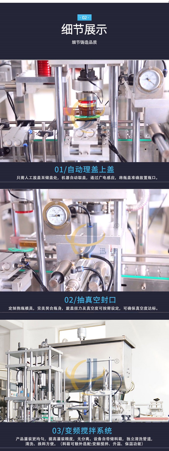 迅捷機械加工設(shè)備齊全,技術(shù)力量雄厚,選用德國PLC控制系統(tǒng)、臺灣AirTac的氣動組件和臺灣伺服的電控組件,從這幾個部件可以看的出來全自動牛肉醬灌裝機改善的不僅是質(zhì)量,生產(chǎn)效率和產(chǎn)品的外觀包裝,還會不斷的引進國際上新的科學(xué)技術(shù),全自動牛肉醬灌裝機用更好的質(zhì)量滿足生活的需求。在自動化生產(chǎn)日漸普及的今天,全自動牛肉醬灌裝機讓企業(yè)的商品以更快的速度出現(xiàn)在市場中,畢竟一些繁雜的工作讓人工去完成的話不但麻煩,效率也不會很高,想要適應(yīng)現(xiàn)代化的大規(guī)模批量生產(chǎn),就需要全自動牛肉醬灌裝機的幫助來代替人工完成這些繁雜的工作。
